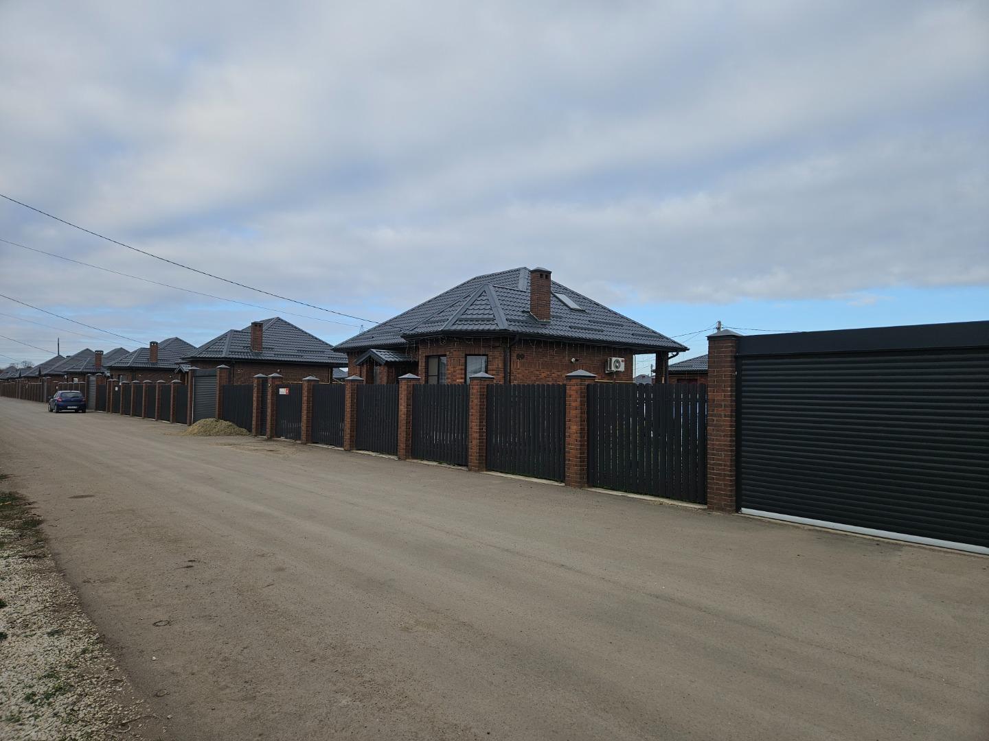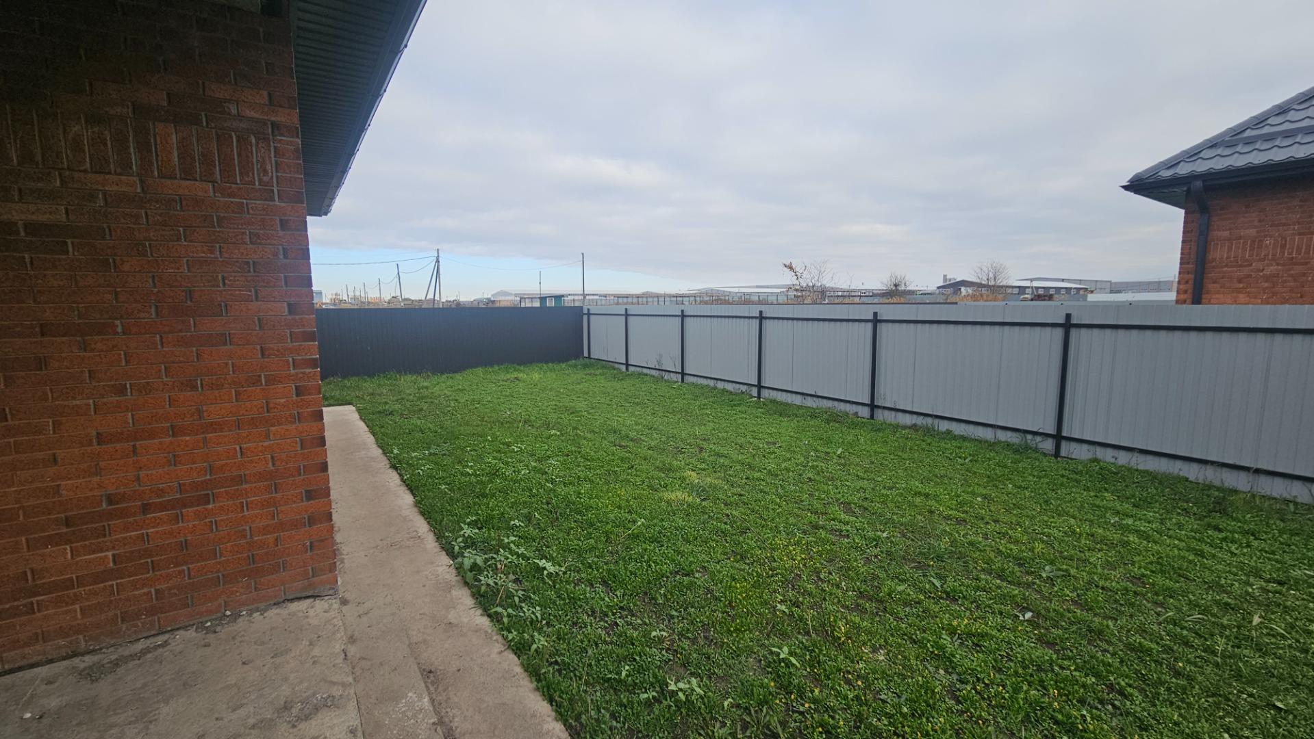 Во дворе асфальтированная площадка под машину, забор - кирпичные колоны и металлический евро штакетник, с соседями забор из металлопрофиля.