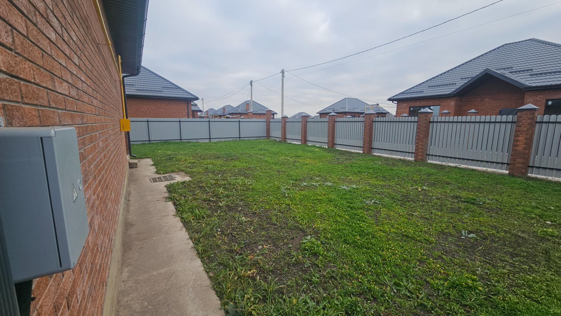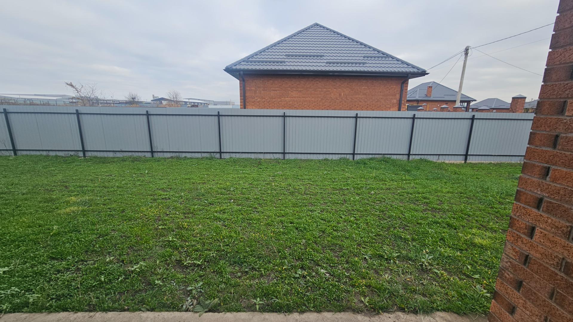 Во дворе асфальтированная площадка под машину, забор - кирпичные колоны и металлический евро штакетник, с соседями забор из металлопрофиля.