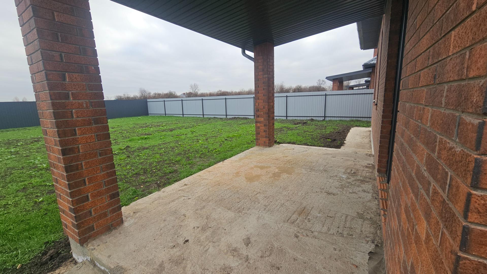 Во дворе асфальтированная площадка под машину, забор - кирпичные колоны и металлический евро штакетник, с соседями забор из металлопрофиля.