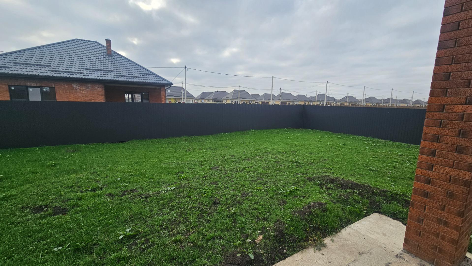 Во дворе асфальтированная площадка под машину, забор - кирпичные колоны и металлический евро штакетник, с соседями забор из металлопрофиля.
